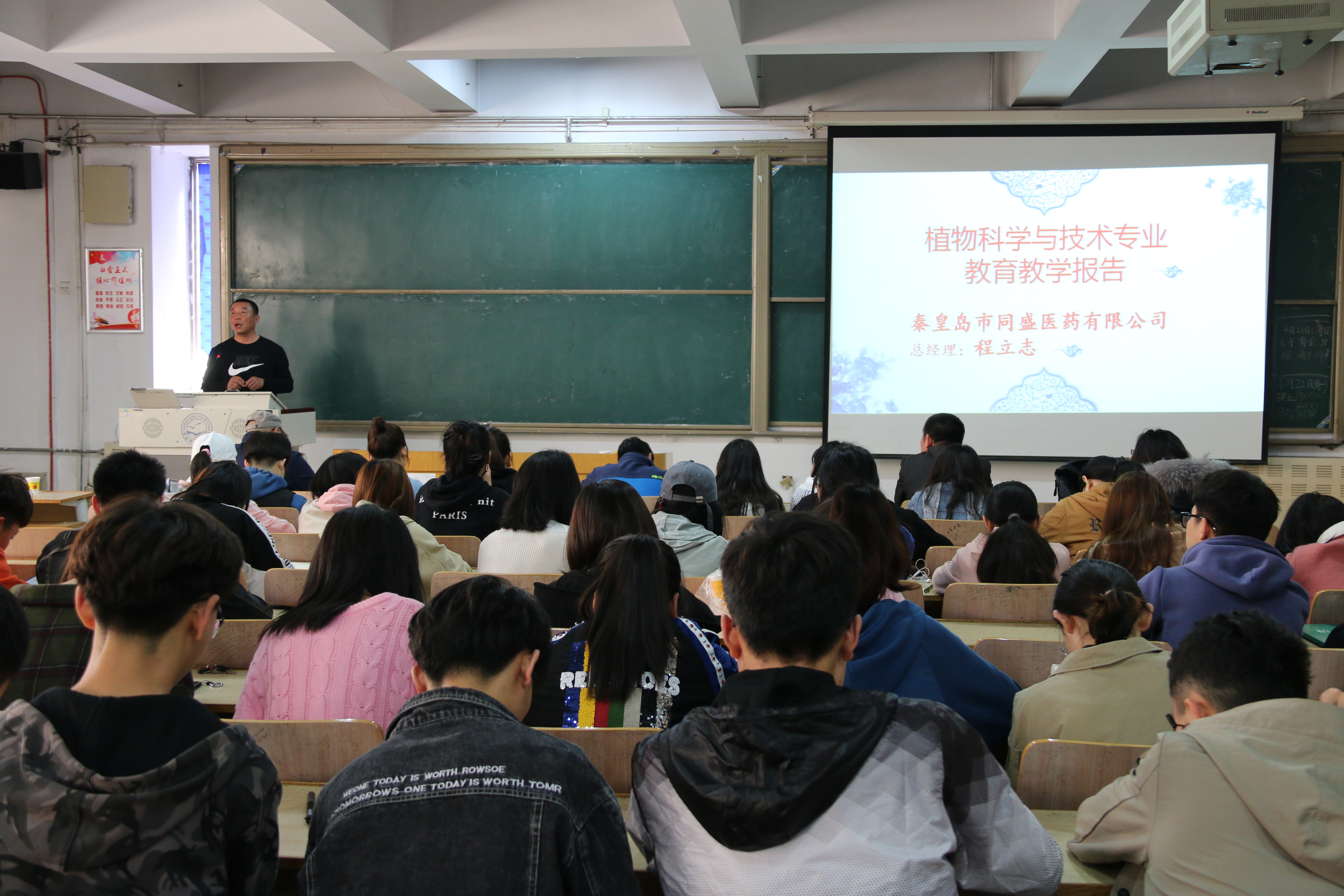 2019年4月21日,beat365官方网站邀请秦皇岛市同盛医药有限公司总经理程立志来我校作题为“中药材发展与人才能力需求”的教育教学报告,植物科学与技术专业、植保专业200余名学生听取了报告。