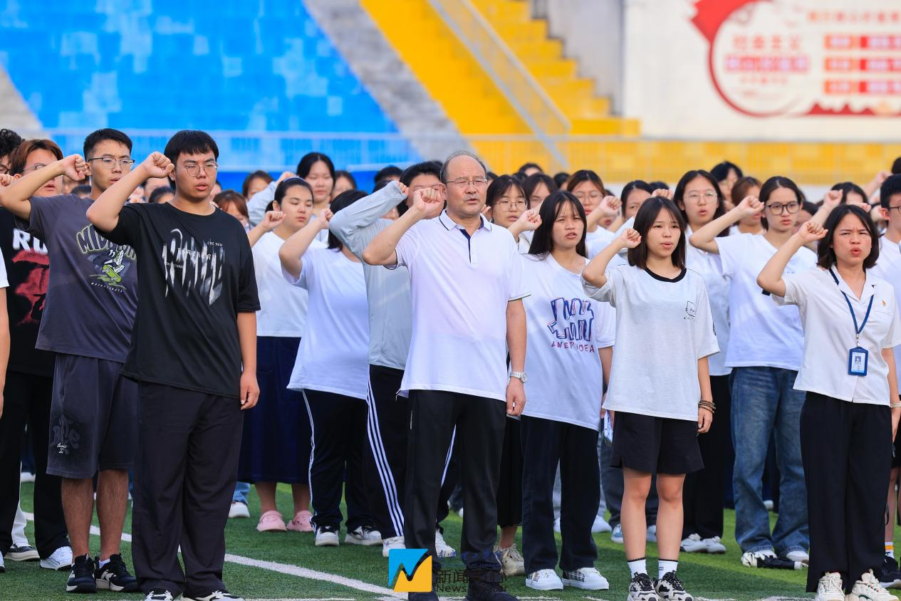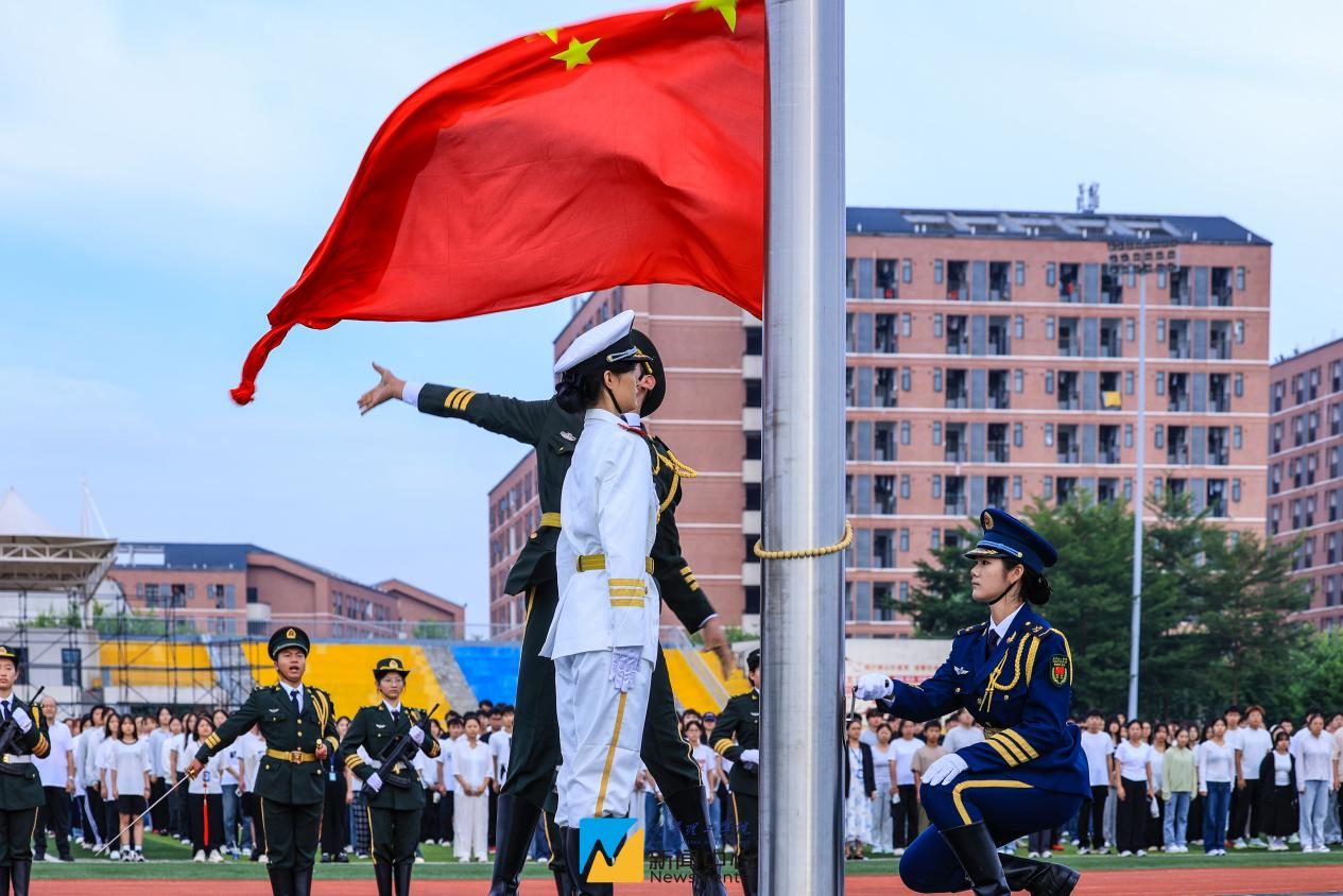 国旗护卫队身着整齐制服,迈着铿锵有力的步伐,庄严护送五星红旗正步走向旗杆。激昂雄壮的《义勇军进行曲》奏响,鲜艳的五星红旗在全体师生的注目礼中冉冉升起。现场师生神情肃穆,齐声高唱国歌,表达对祖国的深深热爱和崇高敬意。