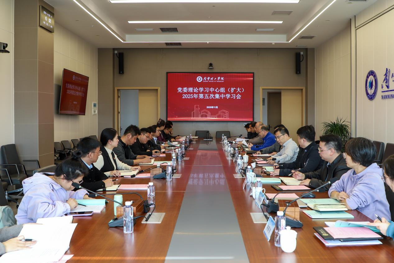 11月 20日下午 ,学校举行 2025 年党委理论学习中心组(扩大)第五次理论学习,专题学习党的二十届四中全会精神。学校党委书记 、督导专员金飞主持学习会并讲话,学校党委委员全体成员出席学习会,各党总支书记以及党群事务部、党委组织部、党委宣传部、党委统战部、党委学生工作部、党委武装工作部、党委教师工作部负责人列席参加学习会。南宁职业技术大学党委宣传部部长李德山列席旁听指导。