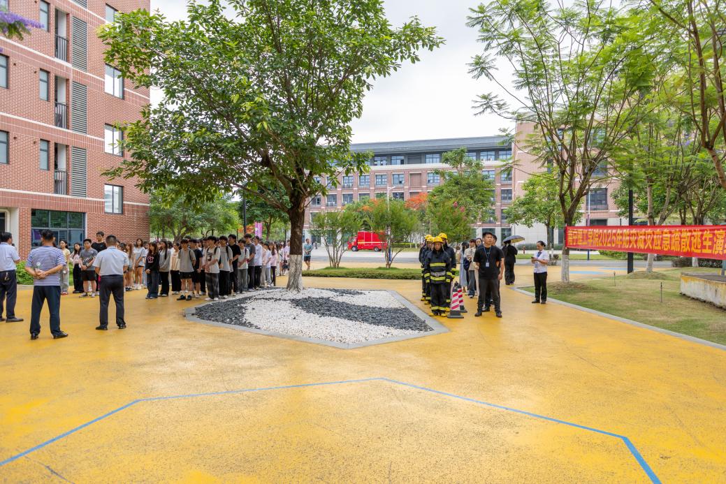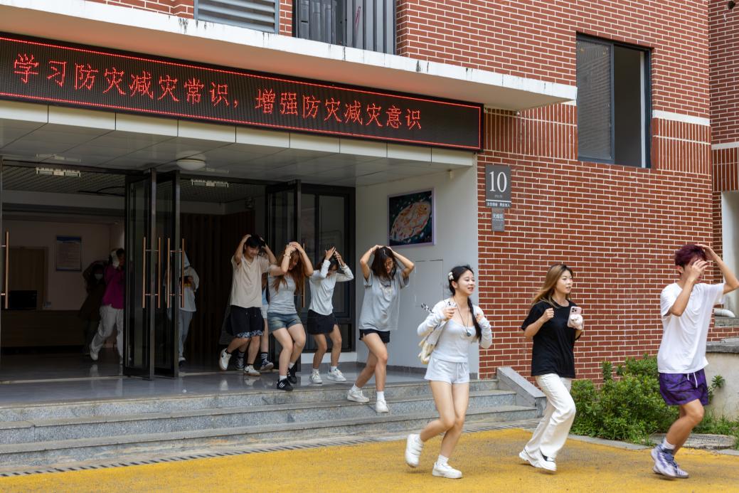 随着尖锐的警报声在校园上空响起,老师和同学们按照预定的疏散演练路线,用手抱住头部,弯腰贴墙,迅速而有序地从G10栋学生公寓疏散到安全地带。