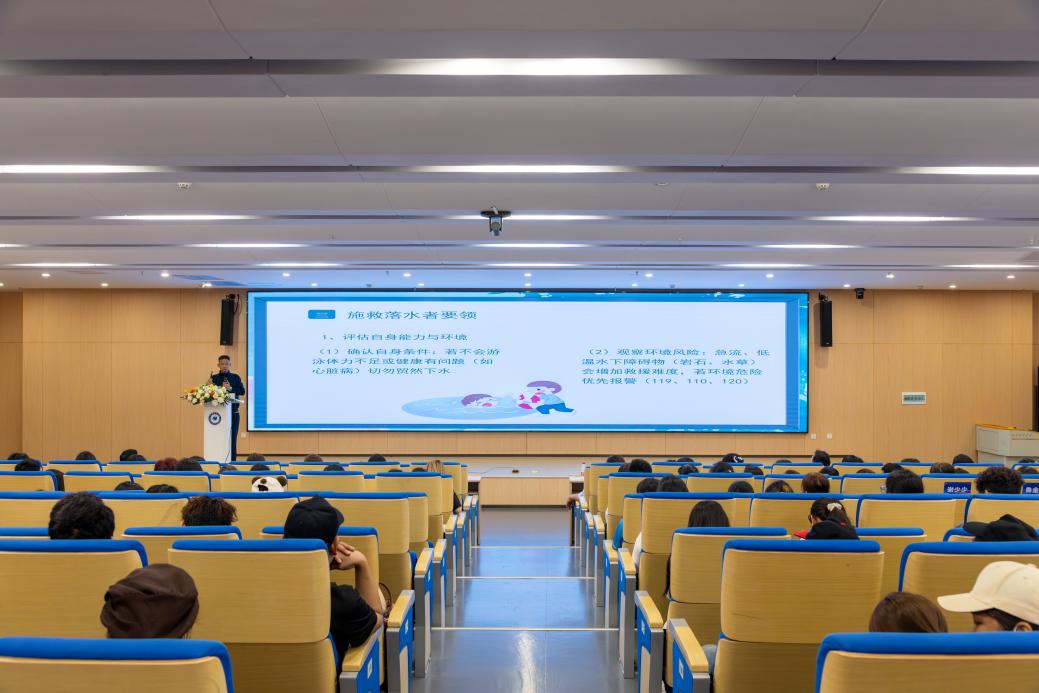 随后,余亮教练进行了溺水救援与自救互救技能培训。他通过生动的案例讲解和现场演示,讲授正确的溺水救援方法和自救技巧。余教练强调,在遇到溺水情况时,保持冷静、迅速判断形势并采取正确的救援行动至关重要。他还提醒老师和同学们,在日常生活中要提高安全意识,避免前往危险水域,确保自身安全。