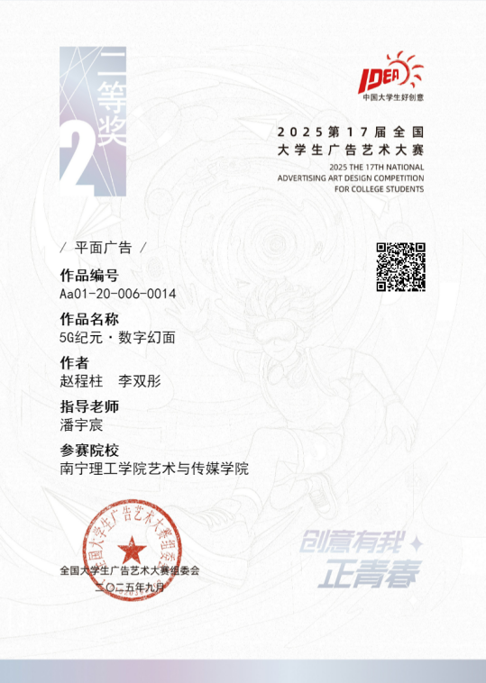 近日,BV伟德艺术与传媒学院学生在第17届全国大学生广告艺术大赛中荣获国家级奖项15项。其中,作品《5纪元·数字幻面》获得全国二等奖;作品《“头”等大事,不容闪失》《一袋》《胃是第二个“心”》获得全国三等奖;另有11项作品获得全国优秀奖;邱野等教师荣获大赛优秀指导教师称号;获奖等级与数量创历史新高,学校获评“优秀参赛院校”。