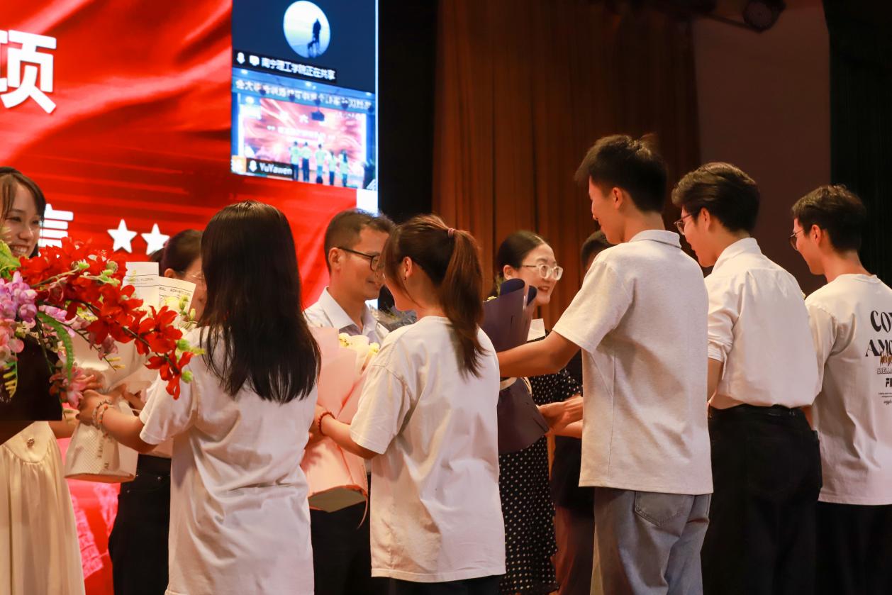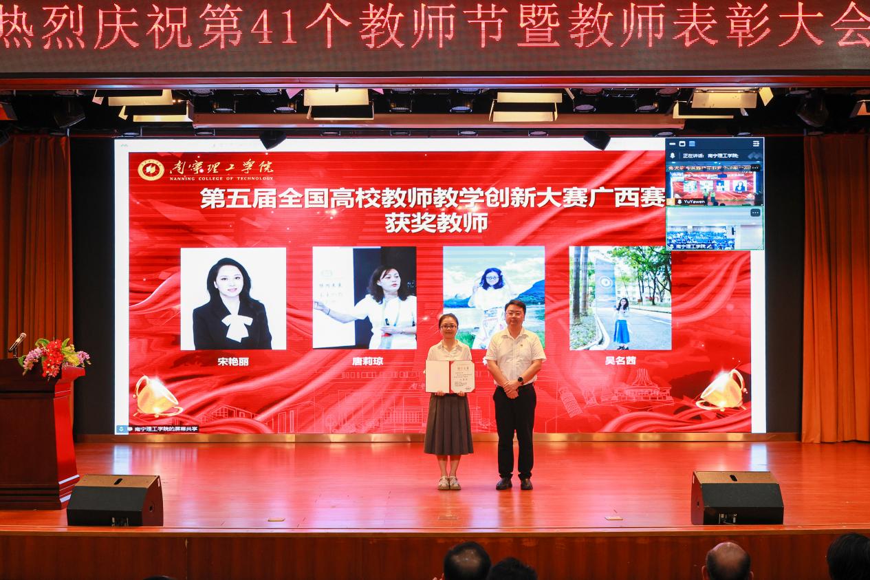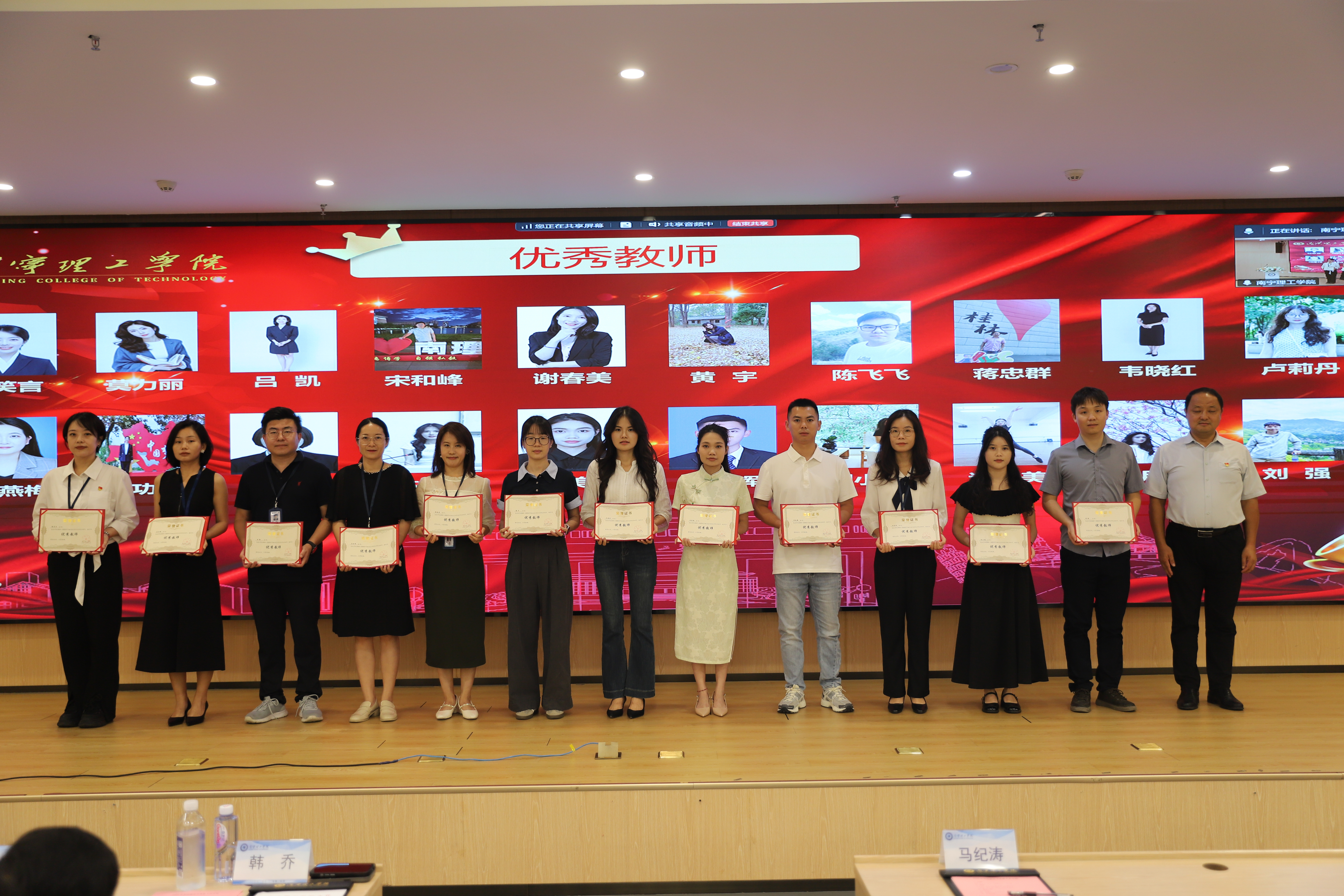 副校长杨鲜丽宣读《关于表彰2024-2025学年教学系列评先评优先进个人及先进集体的决定》;副校长、党委副书记韩乔宣读《关于表彰BV伟德官方网站2024-2025学年度“十佳优秀辅导员”的决定》;纪委书记、校长助理马纪涛宣读《关于表彰2024-2025学年科技先进个人的决定》;校长助理郑方兵宣读《广西高等教育学会关于公布第五届全国高校教师教学创新大赛广西赛区获奖结果的通知》和《广西壮族自治区教育厅关于公布新一轮自治区级实验教学中心建设名单的通知》;党委书记、督导专员金飞宣读《关于表彰2024-2025学年度“师德先进个人”的决定》。与会领导为获奖教师颁发荣誉证书,感谢他们为学校各项事业发展做出的贡献。
