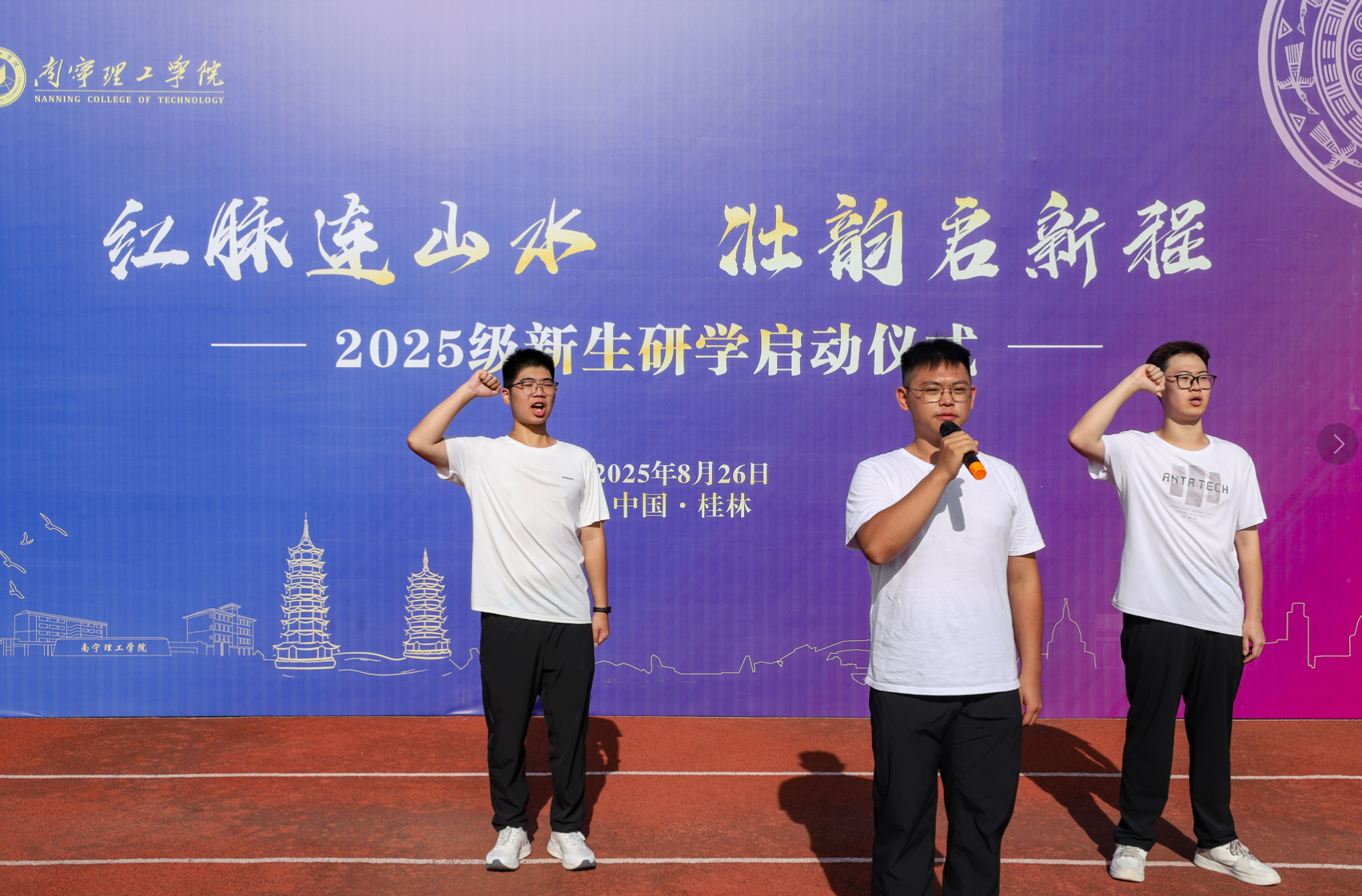 2025年8月26日上午,BV伟德官方网站“红脉连山水,壮韵启新程”2025级新生研学启动仪式在桂林校区和南宁校区运动场同步举行。学校领导冯正垚、杨鲜丽、韩乔、郑方兵、马纪涛,各学院党总支书记、辅导员与2025级新生代表齐聚现场,共赴这场兼具仪式感与教育意义的研学开篇。