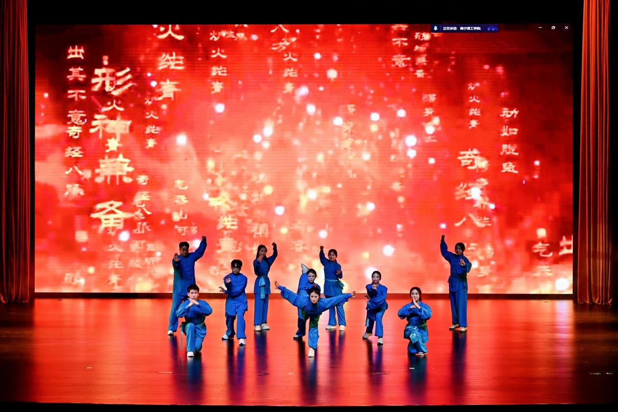 第一篇章深情回望奋斗足迹。艺传学院带来的朗诵《浴火铸丰碑》,以铿锵之声颂扬不朽精神;大数据与人工智能学院则将刚柔并济的《江山美人》武术舞蹈演绎得淋漓尽致,展现了传统文化的独特魅力。马克思主义学院的合唱《如愿》歌声悠扬,寄托了对美好未来的殷切期望;商学院《太湖炫舞荟》则以欢快的舞步,展现了青春的活力与风采。