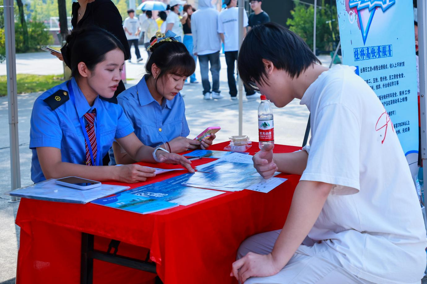双选会以“全方位就业支持”为核心,设置五大专属服务区域,为学生提供“从简历到职业规划”的全链条帮扶。简历打印区现场提供自助免费打印服务,学生注册桂林人才网并完善简历后即可便捷打印,解决求职“最后一公里”难题;就业指导区邀请资深就业指导专家坐阵,开展“一对一”咨询服务,针对职业定位、简历优化、面试技巧等问题精准解答,帮助学生明晰就业方向;政策宣传区由人才政策专家现场解读就业补贴、人才引进等政策,引导学生把握政策红利;AI就业赋能区成为现场“热门打卡点”,通过AI面试模拟系统让学生沉浸式体验面试场景,同时提供简历智能优化、岗位精准匹配服务,助力学生提升求职竞争力;参军入伍咨询区咨询人数超150人,工作人员详细介绍征兵政策、入伍流程及优抚待遇,激发学生参军报国热情。