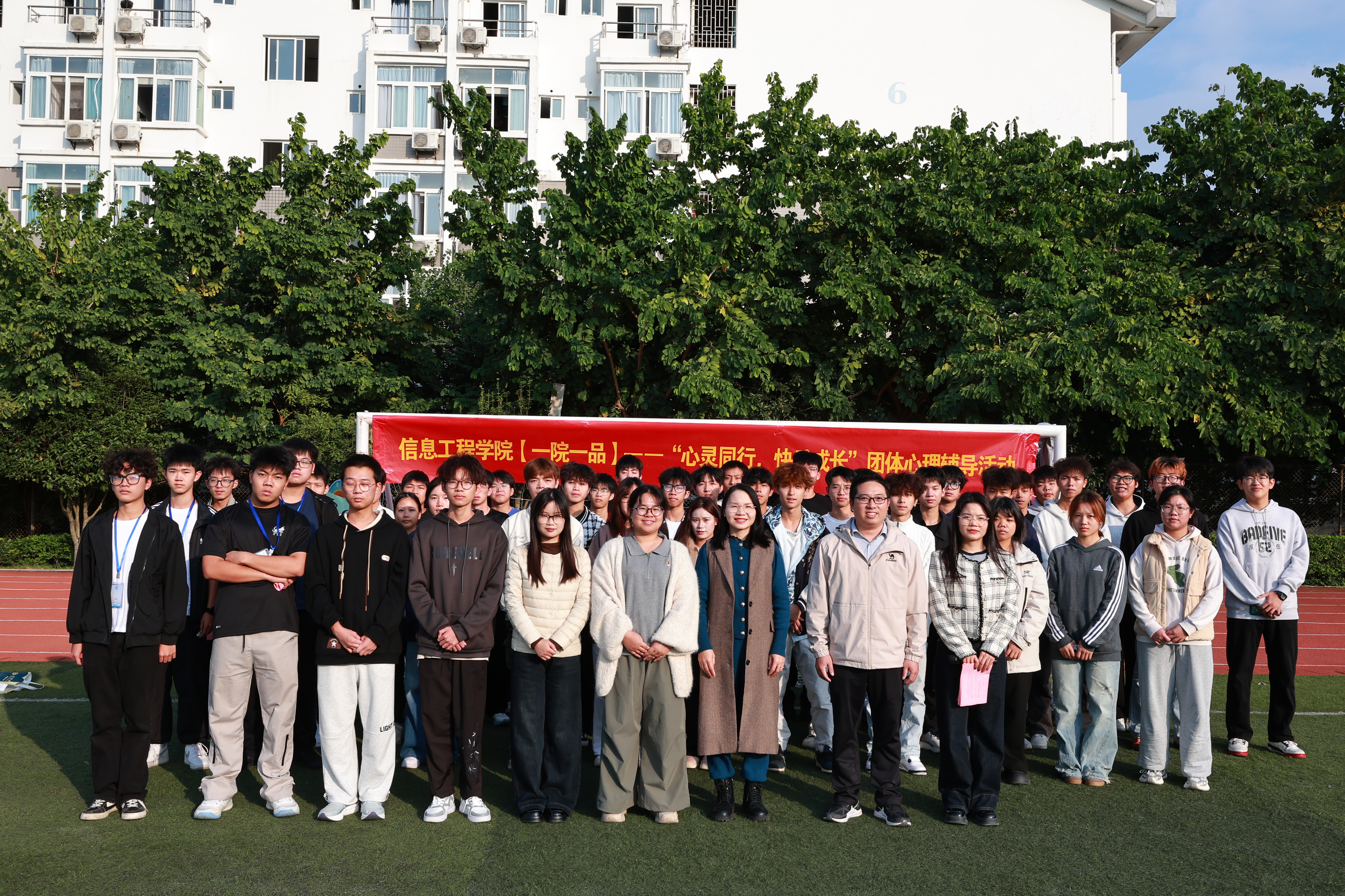 为深入贯彻落实“三全育人”工作理念,全面提升大学生心理素养,缓解学业与生活压力,营造积极健康的校园文化氛围,11月12日下午,信息工程学院在学校足球场开展【一院一品】——“心灵同行,快乐成长”团体心理辅导活动。出席本次活动的有信息工程学院党总支书记王帅老师、学生工作部(处)心理健康教育与咨询中心秦懿昭老师及学院多位辅导员老师,来自大一年级的50余名学生骨干积极参与活动,本次活动由苏桂英老师主持。