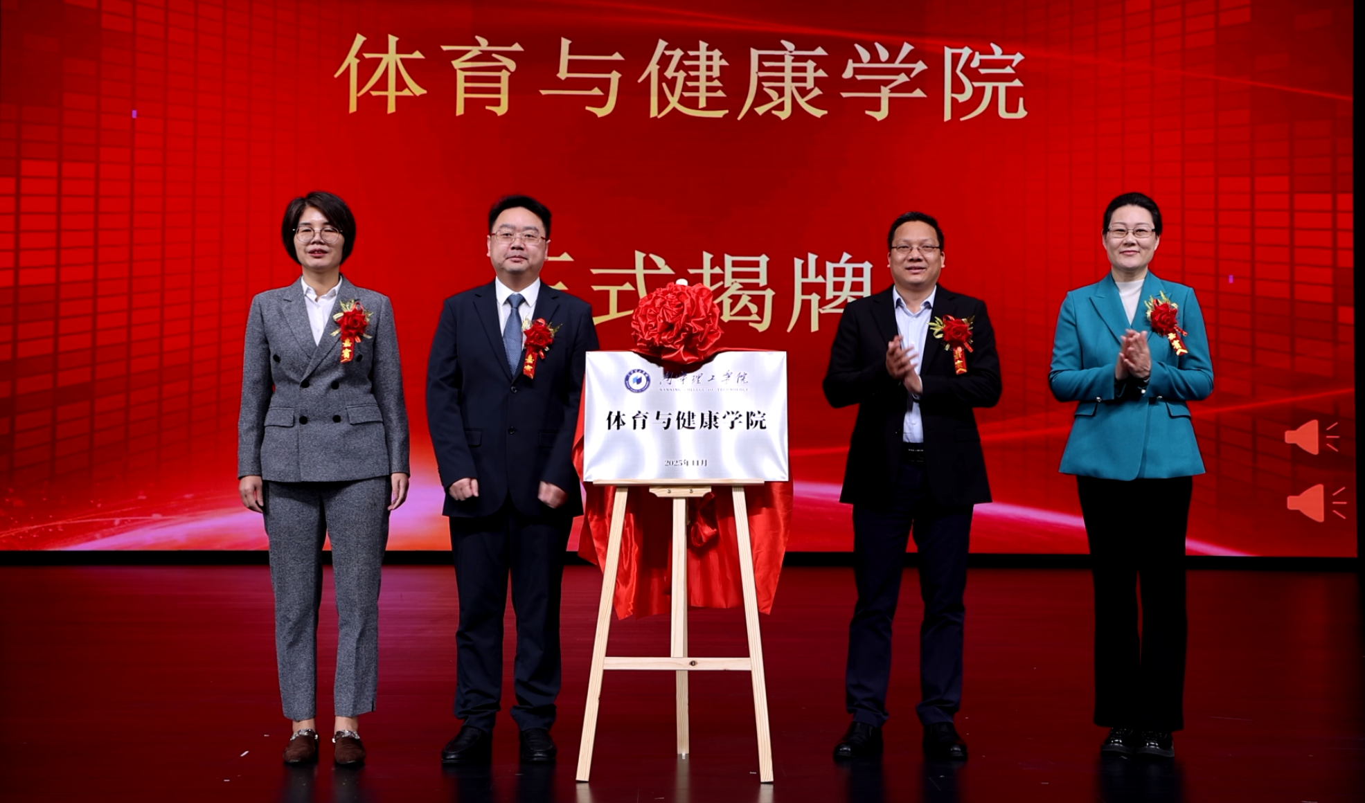 在全体与会人员的热烈期待中,与会领导与嘉宾共同为“BV伟德官方网站体育与健康学院”揭牌。红绸揭开的瞬间,全场掌声雷动,标志着学校体育学科建设正式开启高质量发展的新篇章。
