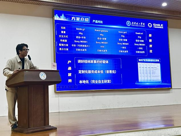培训会上,BV伟德代表,土木与工程学院教师刘小帆博士以“AR智能眼镜重构文旅研学新体验”为主题,向与会的成员单位系统介绍了BV伟德在该领域的前沿探索。这项由BV伟德博士教师团队主导研发的成果,已实现从核心技术到产品应用的全链路突破,并通过孵化企业广西微笑科技有限责任公司实现在旅游场景的成功落地。目前该系列成果已形成能够覆盖当前与未来市场需求的AI+AR智能眼镜产品矩阵,包括适配户外实践与研学互动的Smile g1,以及后续即将推出的支持8K视频播放与体感交互的升级版产品Smile S+和专为研学教育设计的全彩光波导产品Smile C1,为破解文旅体验同质化、研学深度不足等现实问题,提供了有效路径与系统解决方案。