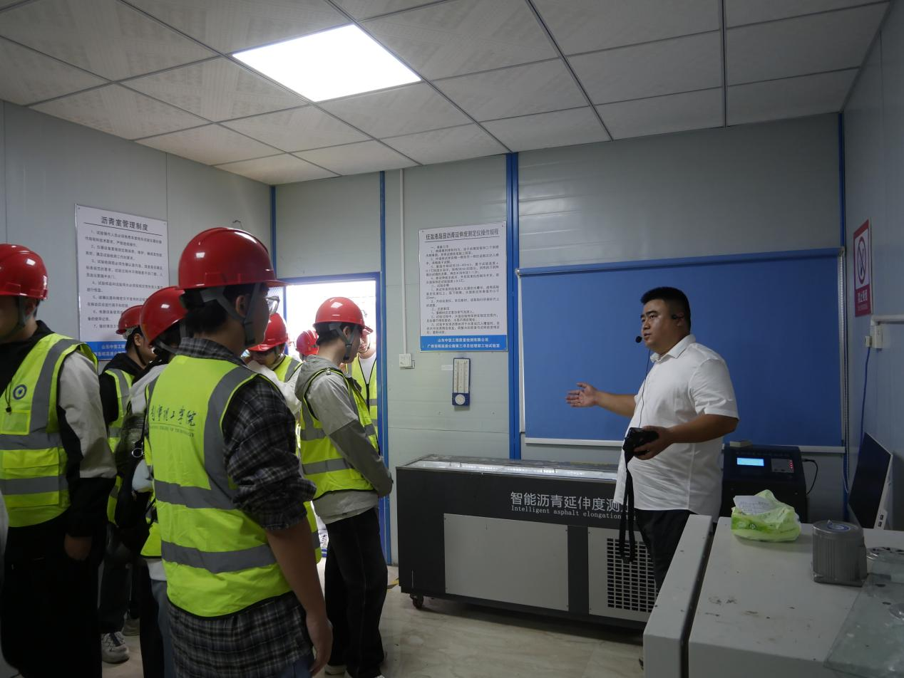 在中心实验室,实验室标准化与检测设备智能化让同学们眼前一亮。实验室主任孙佳林给同学们详细介绍了高速公路项目实验检测的项目、流程与标准,强调了百年大计,质量为本的工程质量方针。