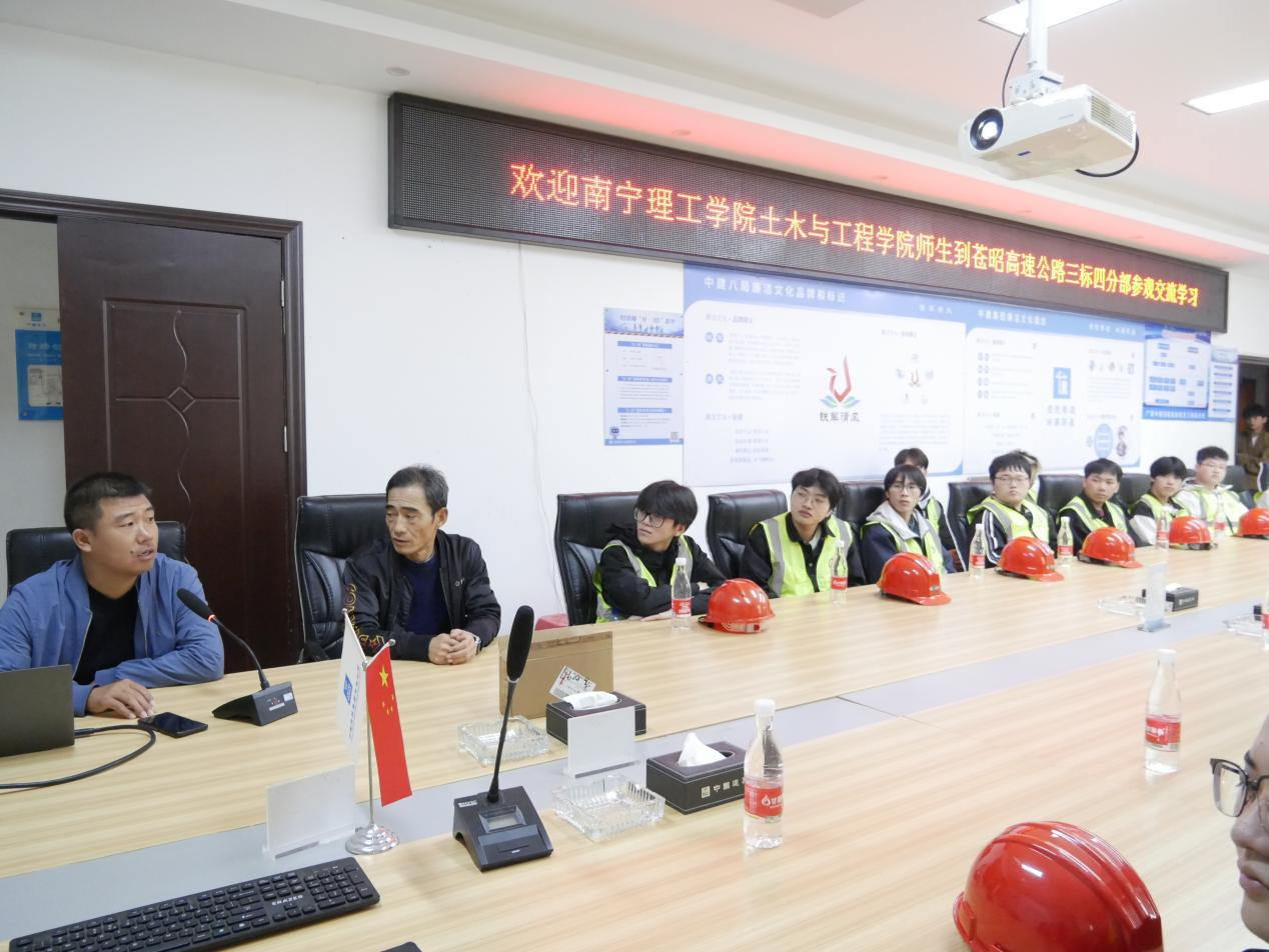 在项目经理部会议室,项目党支部书记张现岭热烈欢迎BV伟德师生前往项目参观交流,勉励同学们学好专业知识、投身广西交通基础设施建设,服务国家交通强国战略。常务副经理李拯稷给同学们作“桂江特大桥施工技术讲座”,项目总工程师释小龙作项目施工技术重难点的讲解。交流环节,项目领导就同学们关心的职业发展、学习规划作了诚恳建议,鼓励同学们树立信心,学好专业知识,提高沟通能力,学会自我调压,锻炼好身体,将来一定大有所为。