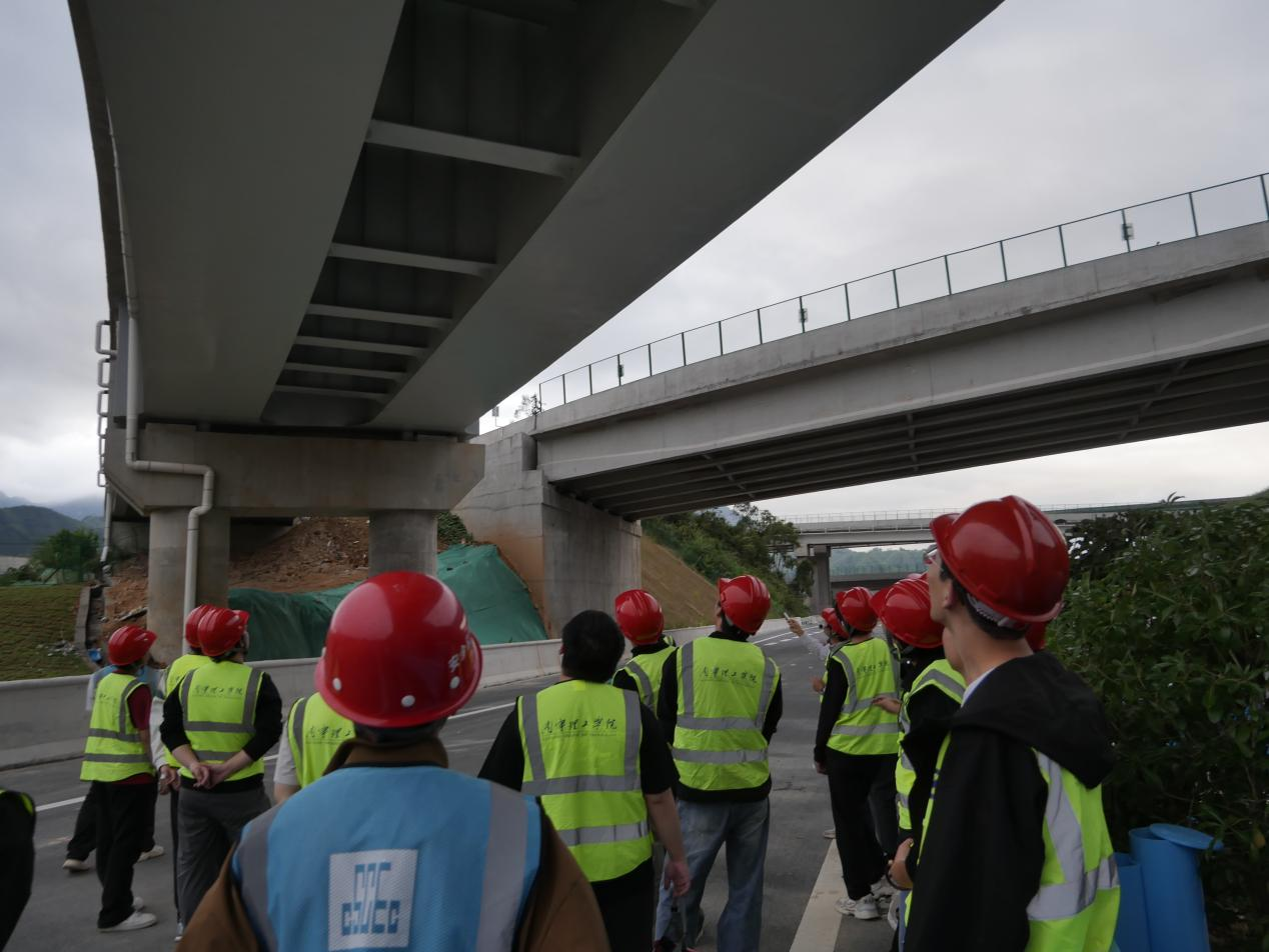 在念田枢纽互通,何盛文老师给同学们讲解了枢纽互通的类型、匝道弯桥的弯剪扭受力特点,钢-混组合梁桥的应用与顶推施工工法。同学们纷纷感叹这是一座座从书本走向现实的“实践桥梁”。