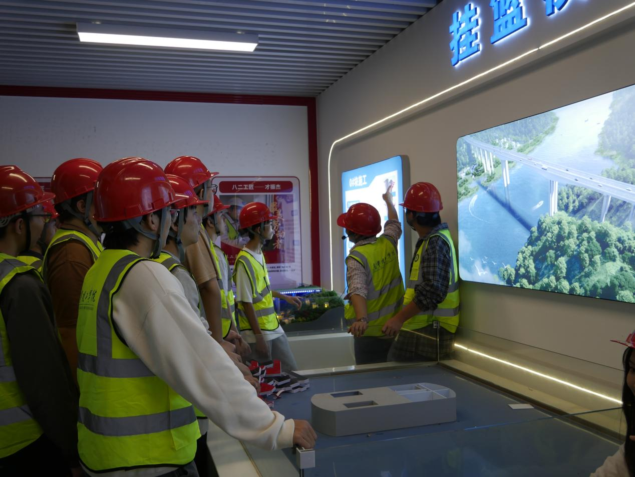 在桂江特大桥施工现场、智慧施工展示区,项目引入的BIM技术应用系统、智能监测设备、无人机巡检平台等现代化施工手段让同学们大开眼界。李拯稷给同学们详细讲解了连续刚构桥受力特点,挂篮施工、预应力施工细节,强调桥梁施工的质量控制,作为桥梁工程师应具有认真细致、精益求精的工匠精神。