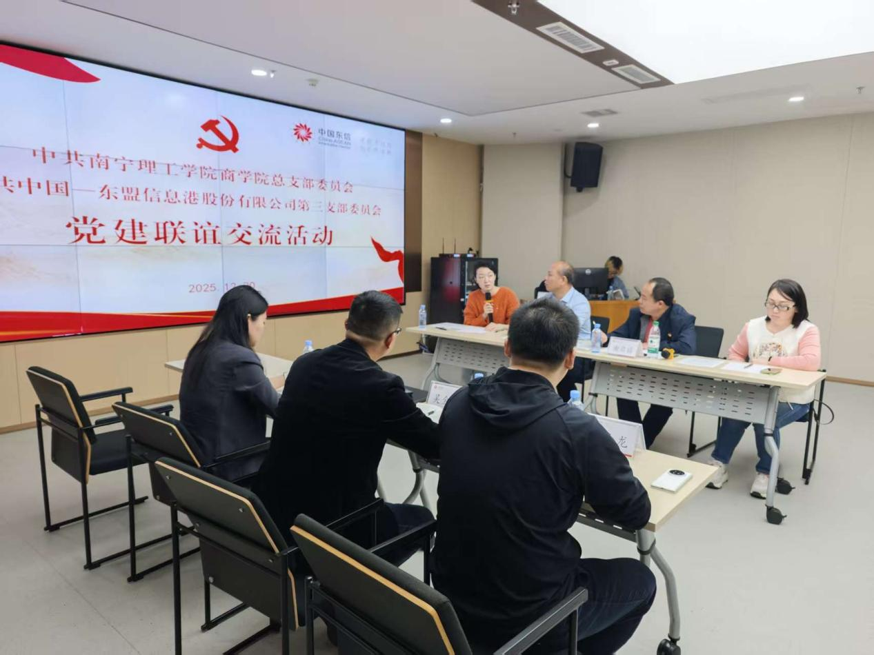 2025年12月20日,BV伟德官方网站商学院教工党支部组织全体党员赴中国—东盟信息港股份有限公司,开展以“党建引领、产教融合”为主题的校企党建联谊与业务交流活动。活动通过实地走访、座谈研讨,旨在展示支部党建成效、对接企业发展需求,探索校企协同新路径,推动党建工作与教学科研、企业发展深度融合。