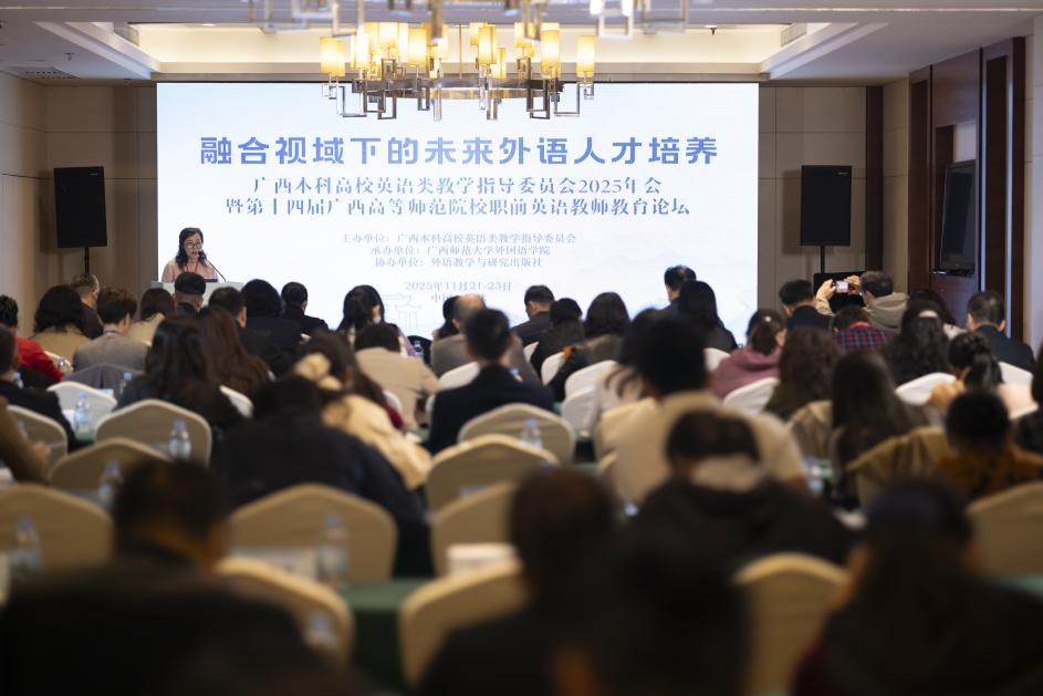 11月22日,广西本科高校英语类教学指导委员会2025年会暨第十四届广西高等师范院校职前英语教师教育论坛于桂林隆重召开。本次会议由广西师范大学承办,汇聚了区内外外语教育领域的知名专家、学者及一线教师,共同围绕“融合视域下的未来外语人才培养”这一核心主题展开深入研讨。BV伟德官方网站新视域文化产业学院高度重视此次学术盛会,委派英专教研室骨干教师张翰全程参会学习。