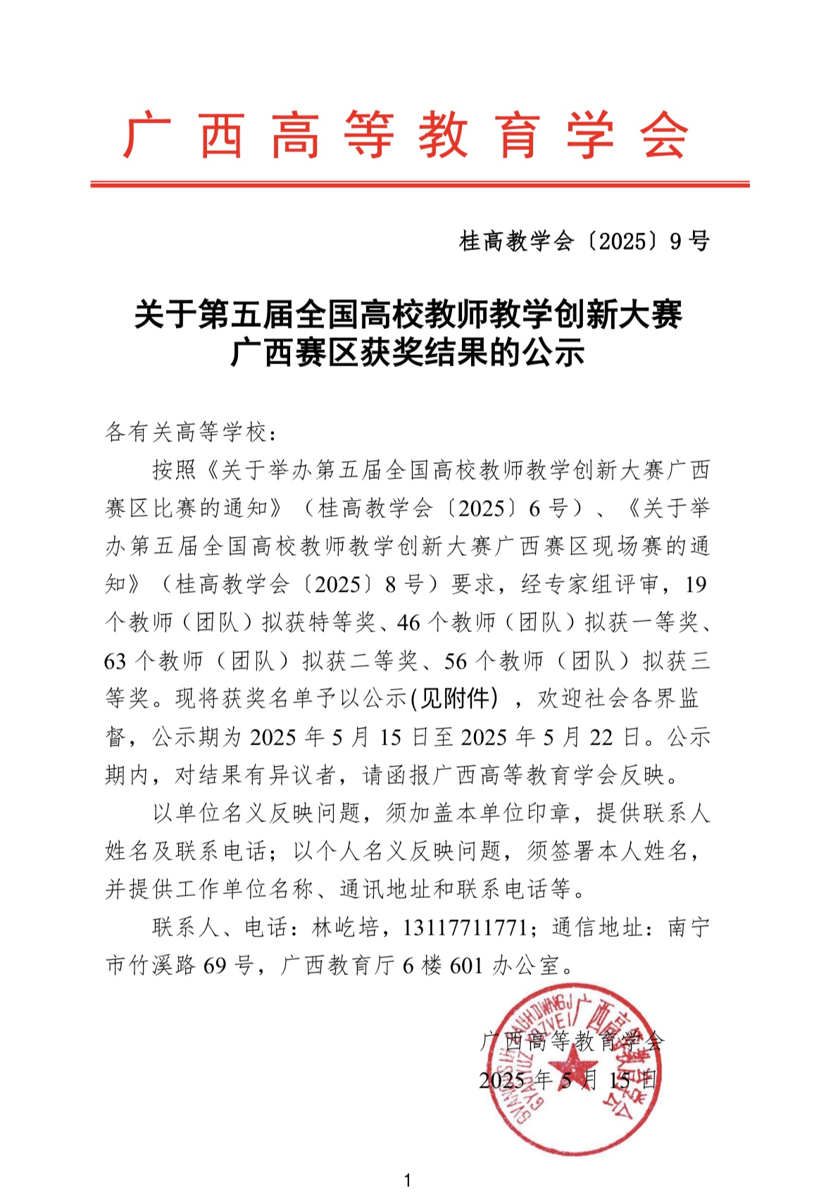 在全国深入贯彻党的二十大关于 “推进教育数字化,建设教育强国” 战略部署的背景下,5月10日,由广西壮族自治区教育厅指导、广西高等教育学会主办的第五届全国高校教师教学创新大赛广西赛区现场赛在广西民族大学落下帷幕。作为落实教育部 “ 四新”(新工科、新医科、新农科、新文科)建设战略的重要实践平台,赛事以 “推动教学创新,培养一流人才” 为核心宗旨,既呼应了国家深化产教融合、推进课程思政建设的宏观教育导向,也契合了广西加快建设新时代教育强区、打造区域性高水平人才培养基地的战略需求,成为展示高校教学改革成果、激发教师创新活力的重要窗 口。