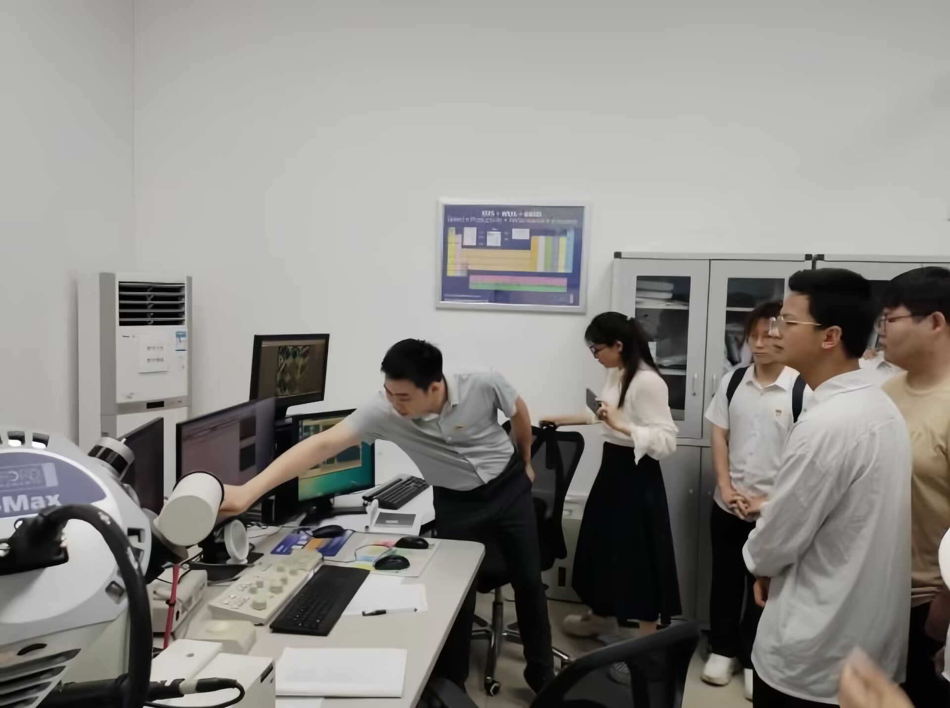 活动伊始,杨锋书记为同志们介绍了第五教工党支部组成及其建设情况。在党建与业务协同发展方面,他详细阐述了广西隐伏金属矿产勘查重点实验室的发展历程、科研涵盖领域和在国内外取得的重大研究成果以及党员同志在日常管理工作中发挥的重要作用。随后,在其支部党员刘奕志老师的带领下,大家有序进入重点实验室,依次参观了电子探针实验室、扫描电镜实验室、激光烧灼等离子质谱实验室、X射线荧光光谱实验室、激光拉曼实验室和红外显微镜流体包裹体测温实验室。党员同志们对应用电子探针开展嫦娥五号月壤样品的测试分析表现出浓厚兴趣,并与刘老师展开深入交流。在惊叹于科研仪器的先进精密之余,党员同志和优秀学子代表投身科研的决心更加坚定,向上深造、共建强国的信念也愈发明晰。