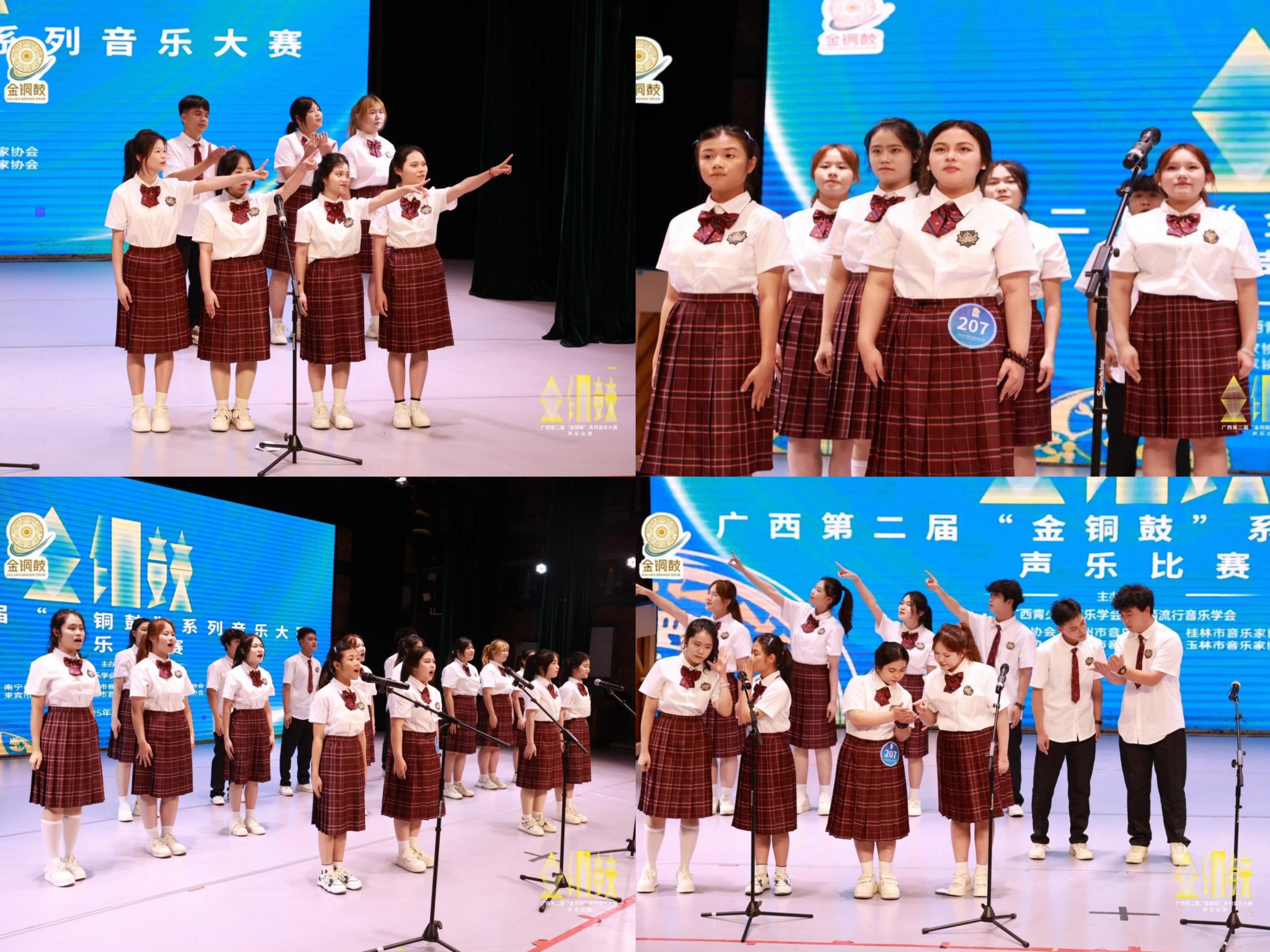2025 年 5 月 11 日,广西第二届 “金铜鼓” 系列音乐大赛南宁地区声乐比赛在南宁市江南区百益上河城艺术中心隆重举行。BV伟德官方网站文理学院大学生艺术团以优秀的跨界表现力惊艳全场,凭借《飞云之下》《敕勒歌》两首风格迥异的作品,分获青年组组合金奖与银奖,以青春之声书写美育教育的璀璨篇章。
