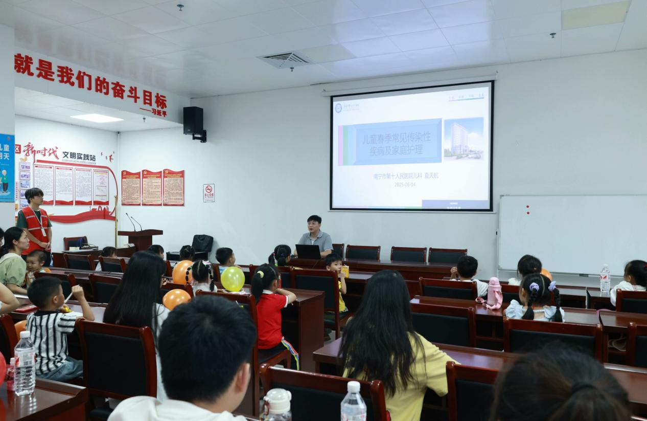 聚焦儿童春夏季传染病预防,南宁市第十人民医院医护团队化身为“健康播种者”,用童趣化语言与互动问答,将复杂的医学知识转化为易懂的防护口诀。“七步洗手法儿歌”“口罩正确佩戴小妙招”等实用内容,让科学防护意识在孩子们心中生根发芽。