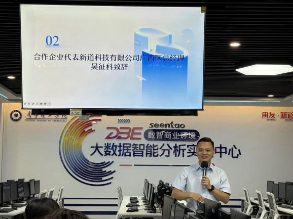 本次论坛以“数据•智汇•共享”为主题,旨在深化校企合作,推动智能会计产业学院的可持续发展。活动于9:30正式开始,商学院院长姚瑞基致开幕辞,对与会嘉宾表示热烈欢迎,期待通过校企协同育人,培养更多适应行业需求的复合型人才。活动伊始,商学院院长姚瑞基代表学院向所有合作伙伴致以衷心感谢。他在致辞中表示:“学院的发展离不开各位合作伙伴的鼎力支持。正是有了新道科技、FINS瑞熠等优秀企业的真诚相助,我们才能在产教融合、协同育人的道路上不断取得新突破。”