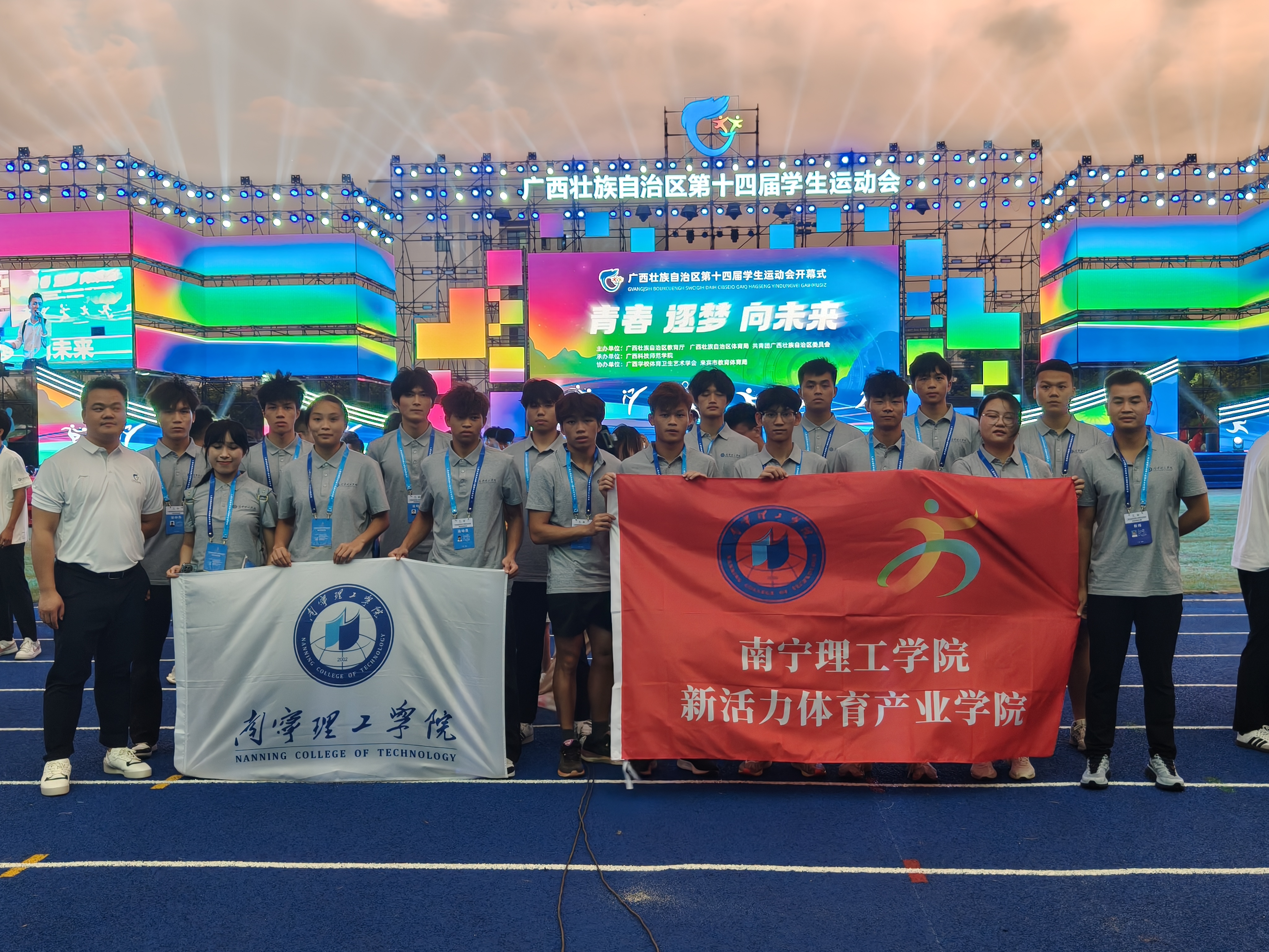 7月11日晚,广西壮族自治区第十四届学生运动会在广西科技师范学院来宾校区举行,学校团委书记钟俊光、体育专业教研室杨正东、何优以及田径队全体运动员参加开幕式。