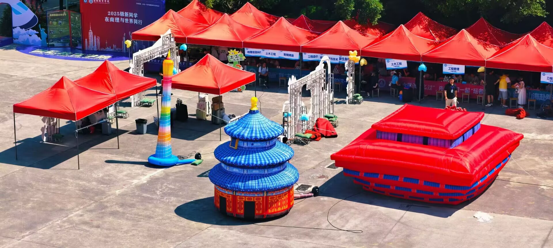 3.专业特色拉满:特别布置中国著名建筑充气气模微缩模型——鸟巢的钢结构、广州塔的曲线、世博馆的现代感、祈年殿的古典美,不仅成为现场“打卡热点”,更让新生提前感受土木工程的魅力,家长们纷纷感叹“这才是土木学院的专属仪式感!”