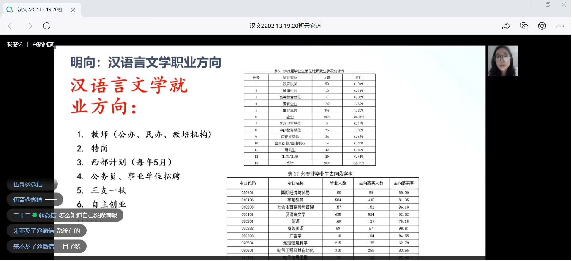 ”云·家访“活动上,各年级辅导员作了针对家长及学生的假期注意事项,结合近期发生的典型案例,防范溺水、电信诈骗、社会实践等安全要点提示,强调了假期安全的重要性,让安全意识深入人心。同时针对不同年级、不同专业特点,建议学生及家长做好学业生涯规划,抓住综合能力提升关键期。低年级辅导员围绕评奖评优的具体标准、国家资助政策的覆盖范围和申请流程进行细致解读。同时,鼓励学生积极参与学院开展的学术讲座、技能培训等多维赋能活动,为未来的发展打下坚实基础。高年级辅导员积极开展就业指导,通过展示国内考研与海外升学在报考流程、培养模式、就业前景等方面的异同点,并开展国际化教育宣传。特别是针对毕业生,辅导员们详细讲解了实习就业的准备要点,梳理出清晰的就业备考时间轴,帮助学生明确考研和求职过程中的关键节点。