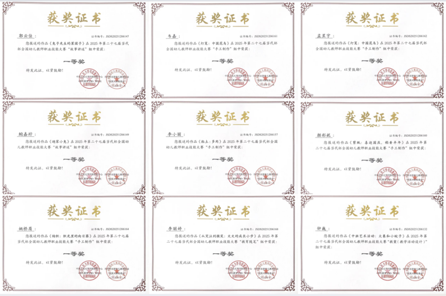 学院学前教育教研室因组织有序、指导得力,获评“促进师资专业发展先进单位”;零漫、刘丽华、韦丽妹、李海萍四位教师荣获“优秀指导奖”。学生钟巍、郭云佳、鲍嘉柠、李小丽、颜彩妮、韦嘉、孟星宇、姚桥眉、李丽婷等在不同赛项中脱颖而出,荣获一等奖,充分体现了学院“以赛促教、以赛促学”教学模式的积极成效。